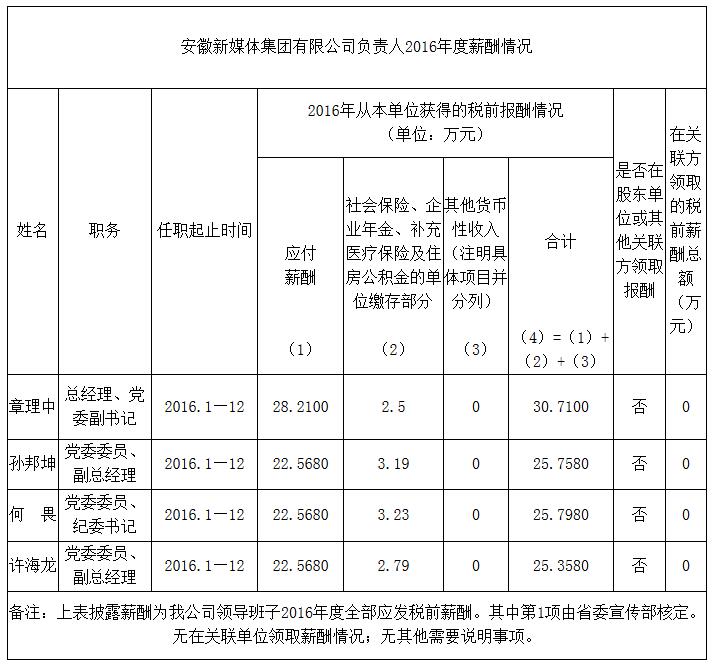 安徽新媒體集團有限公司負責人2016年度薪酬情況